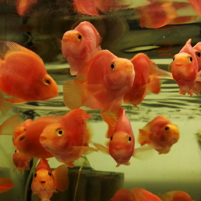 この魚は1980年代に台湾で初めて交雑に成功し、それ以降世界に広まり、特にアジアで人気がある品種となっています。たまに青やピンク色のパロットファイヤーもいますが、それは人工的に着色されたもので、時間がたつと色が消えるそうです。